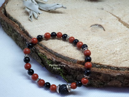 Bracelet réalisé avec des graines naturelles de "Rudraksha" de diamètre 6mm et des perles naturelles de "Pierre de Lave" de diamètre 6mm.