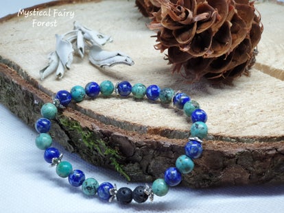 Les perles ont été soigneusement sélectionnées pour vous procurer tous les bienfaits (en lithothérapie) de la Pierre de Lapis-Lazuli, de la pierre de Turquoise et de Pierre de Lave.
