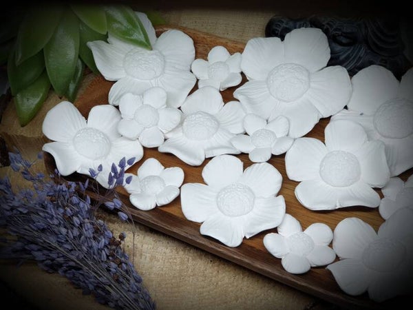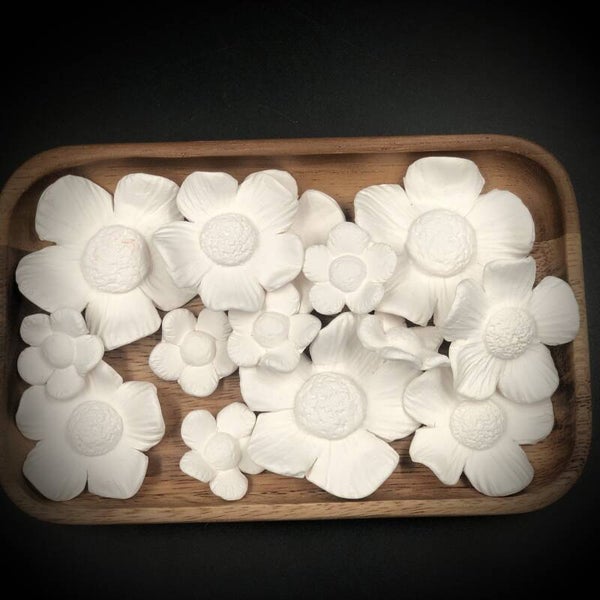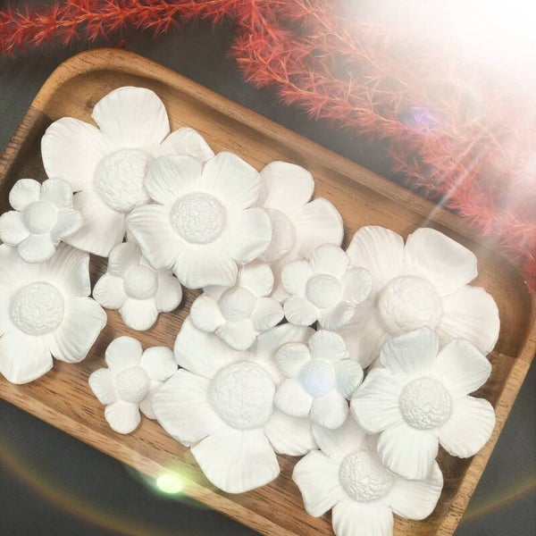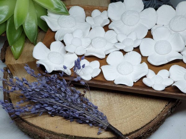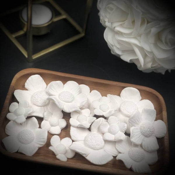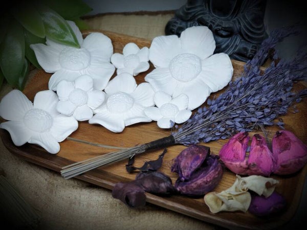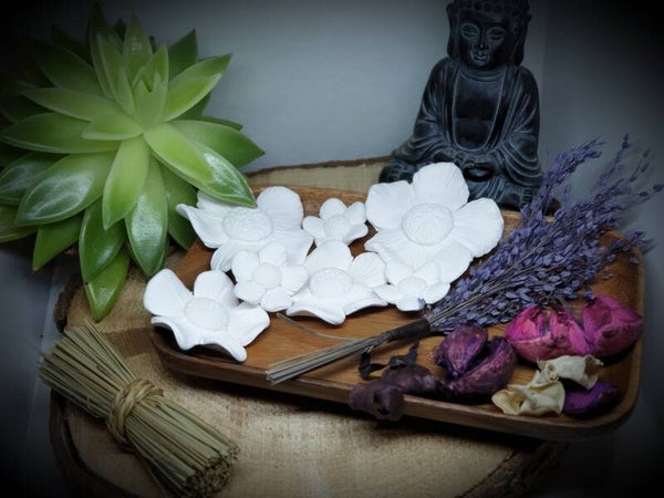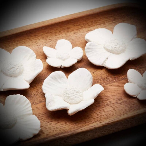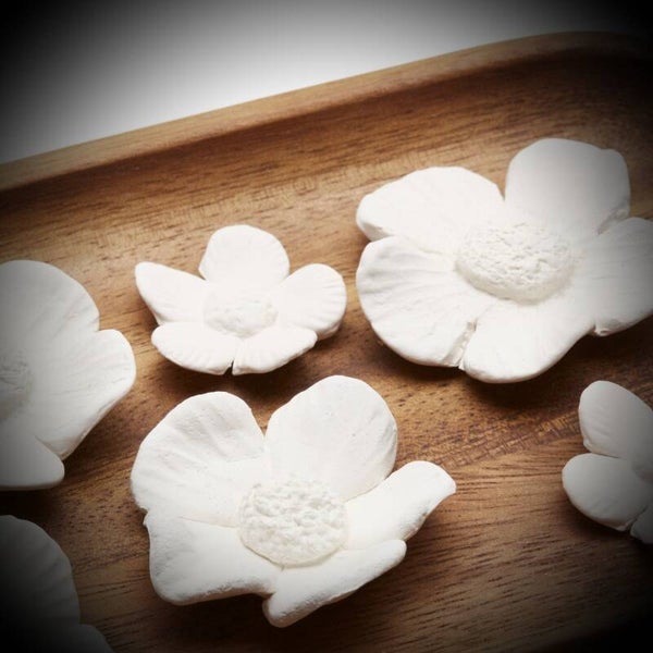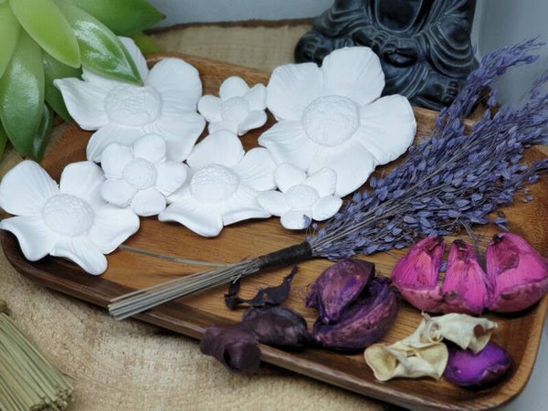 Plateau en bois d'Acacia naturel avec ses Fleurs en céramique à parfumer avec une huile essentielle ou un concentré de parfum.