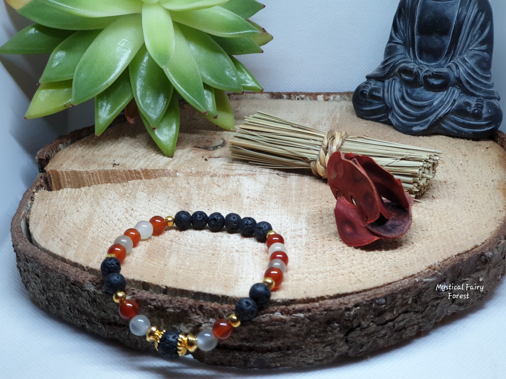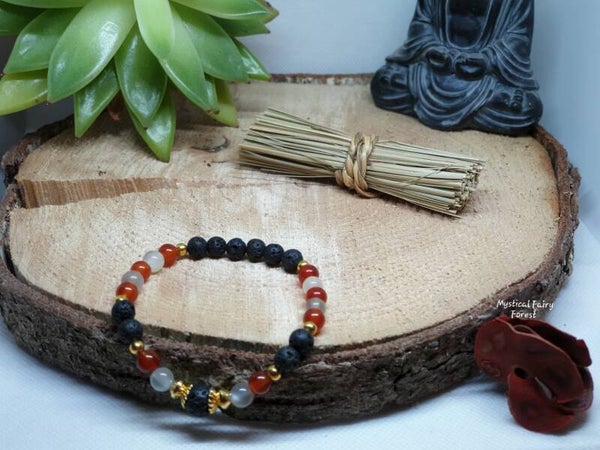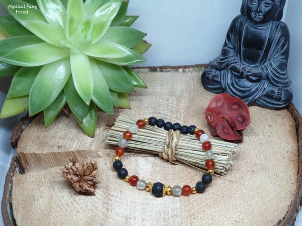 Le bracelet diffuseur Svãdisthãna a été réalisé avec des perles naturelles de Cornaline, de Pierre de Lune multicolore et de Pierres de lave.