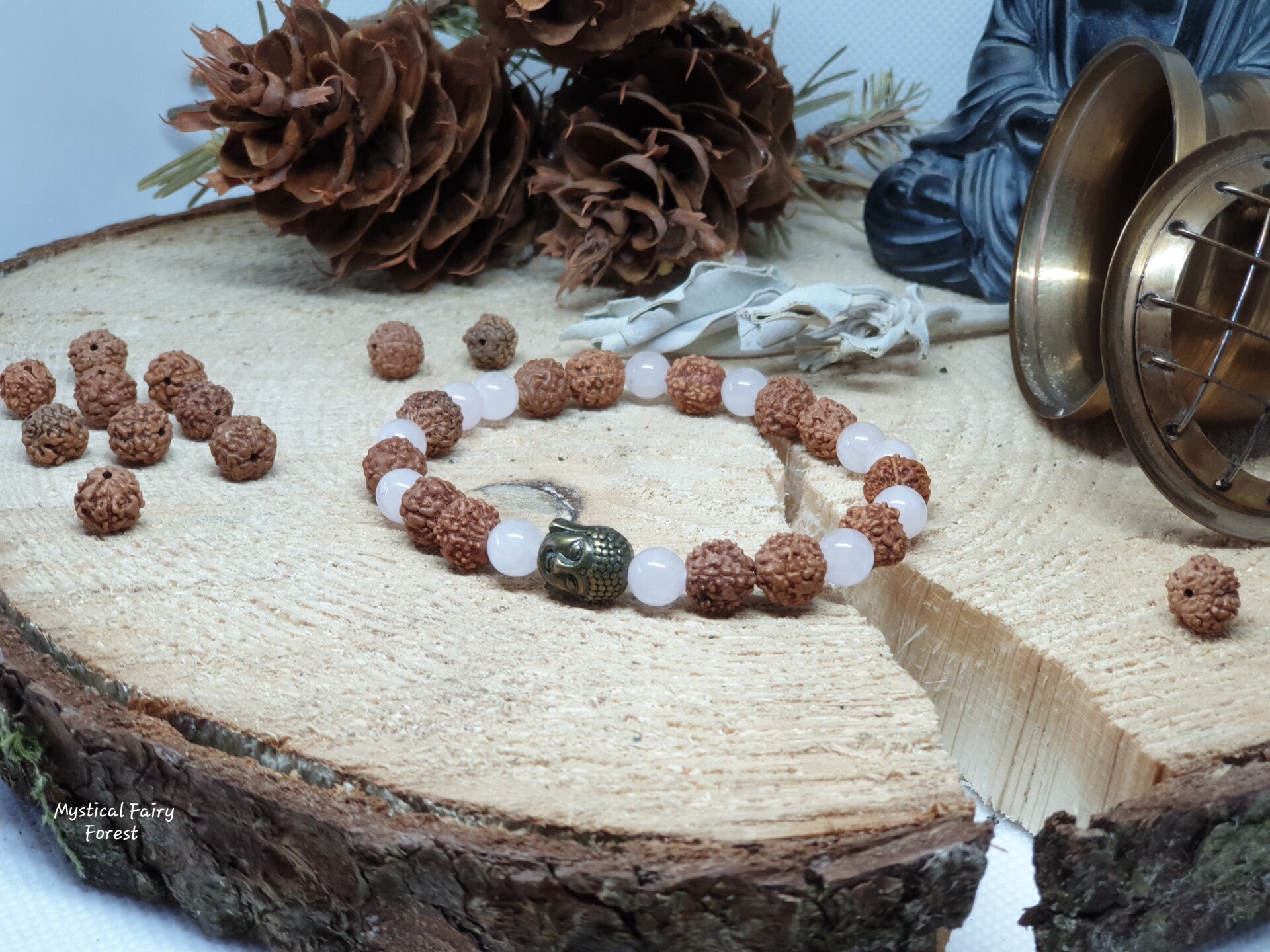 Ce bracelet a été réalisé avec des Graines de Rudraksha véritables de diamètre 8mm et des pierres naturelles de Quartz rose de diamètre 6mm.