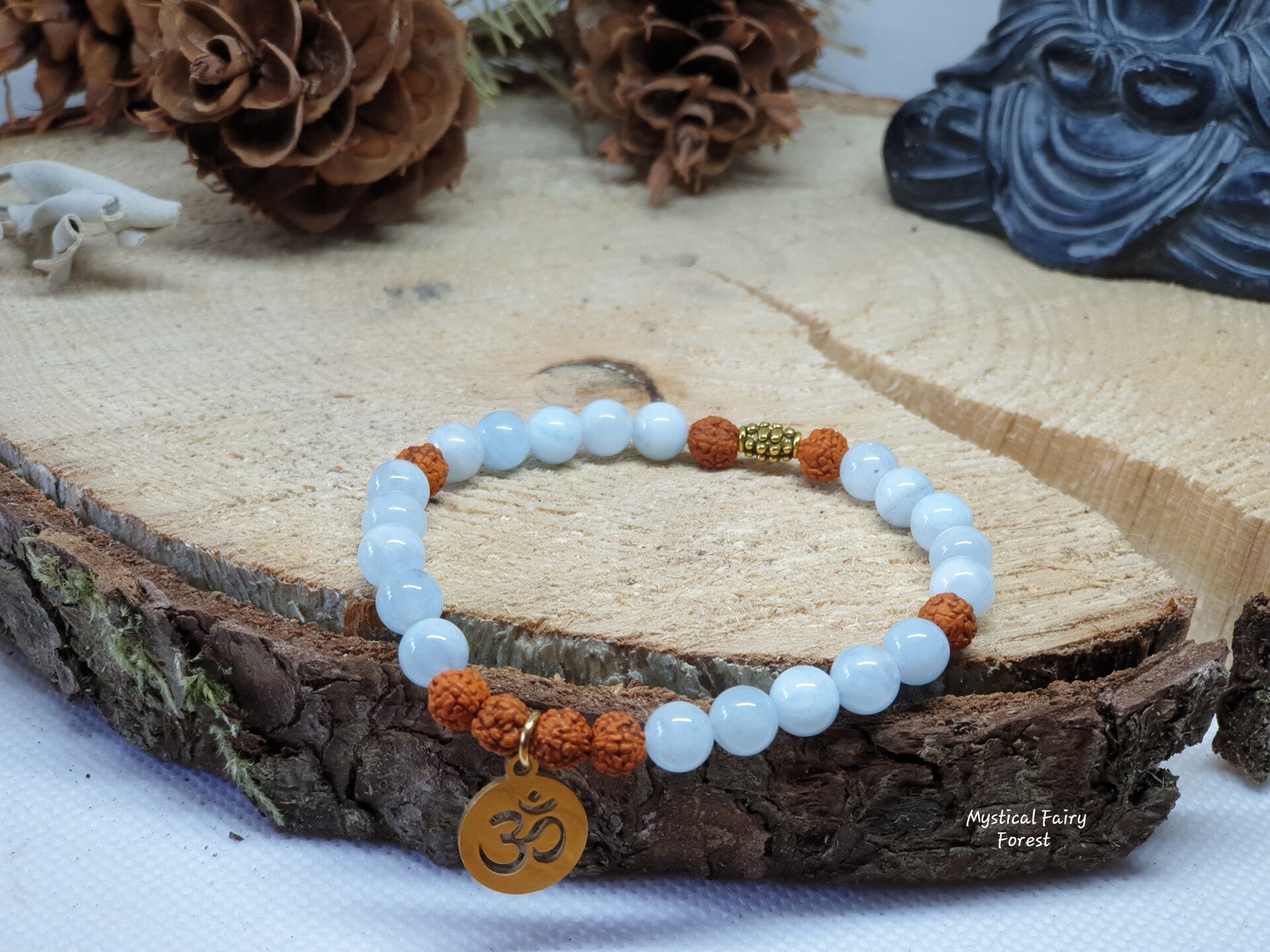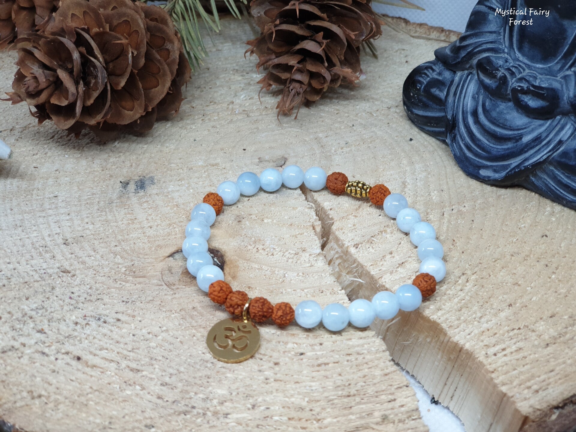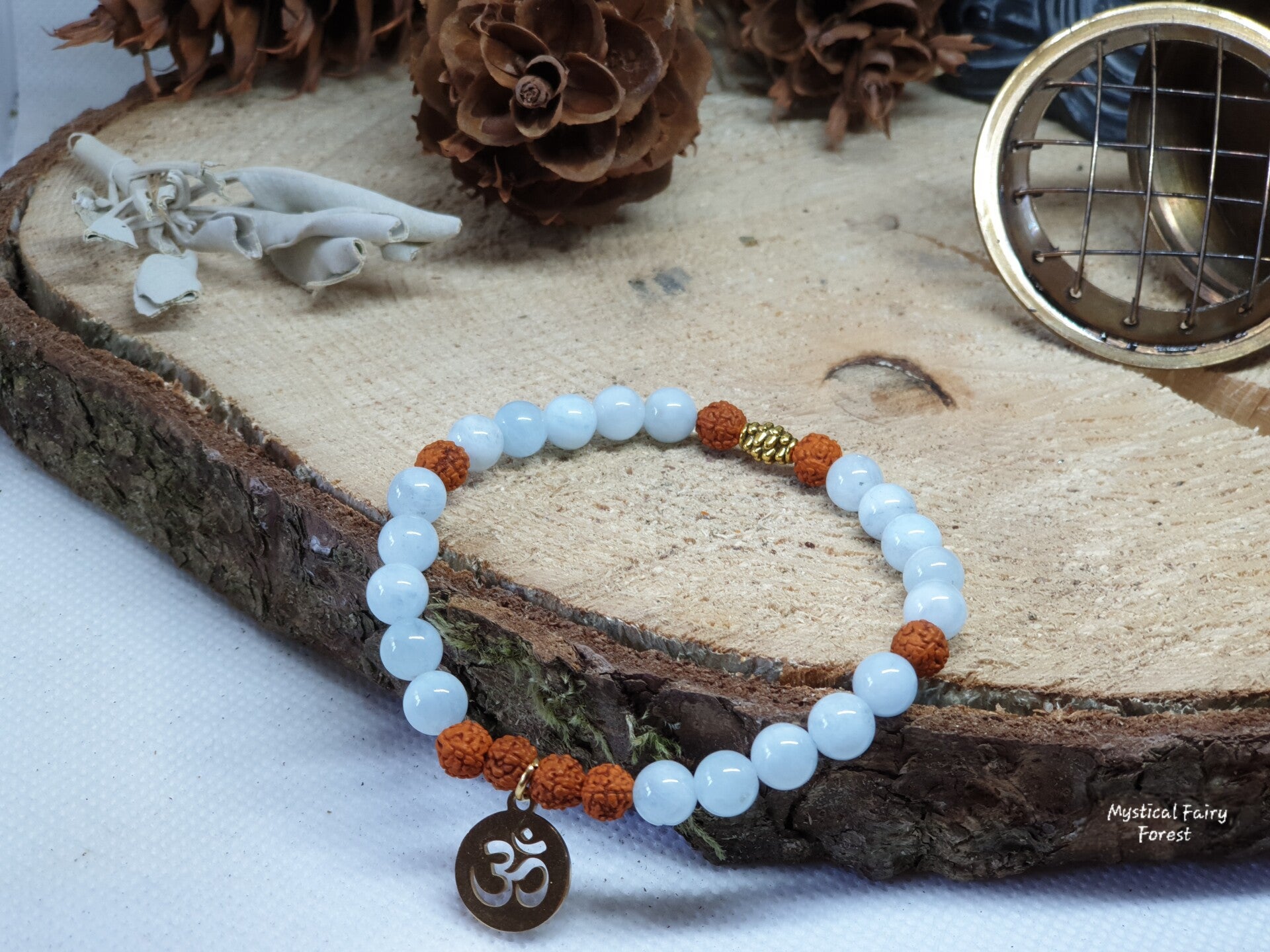 Bracelet réalisé avec des graines naturelles de "Rudraksha" de diamètre 6mm et des perles naturelles "d'Aigue Marine" de diamètre 6mm.