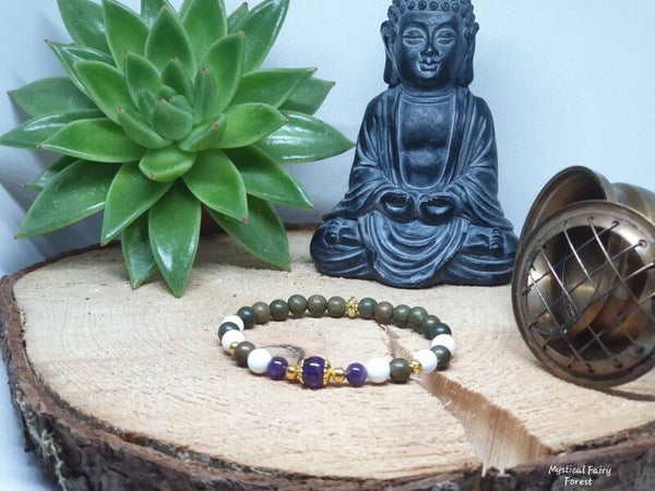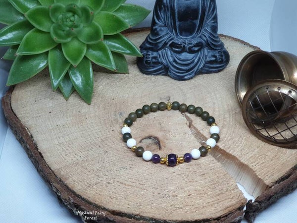 Ce bracelet a été réalisé avec des perles naturelles de Bois de Santal vert de haute qualité de diamètre 6mm, des Perles de Bénitier (Tricdana) véritables de 6,5mm et des pierres naturelles d'Améthyste d'Uruguay de diamètre 6mm et 8mm.
