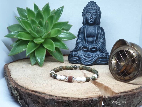 Ce bracelet a été réalisé avec des perles naturelles de Bois de Santal vert de haute qualité de diamètre 6mm, des Perles de Bénitier (Tricdana) véritables de 6,5mm et d'une Graine de Rudraksha véritable de diamètre 8mm.