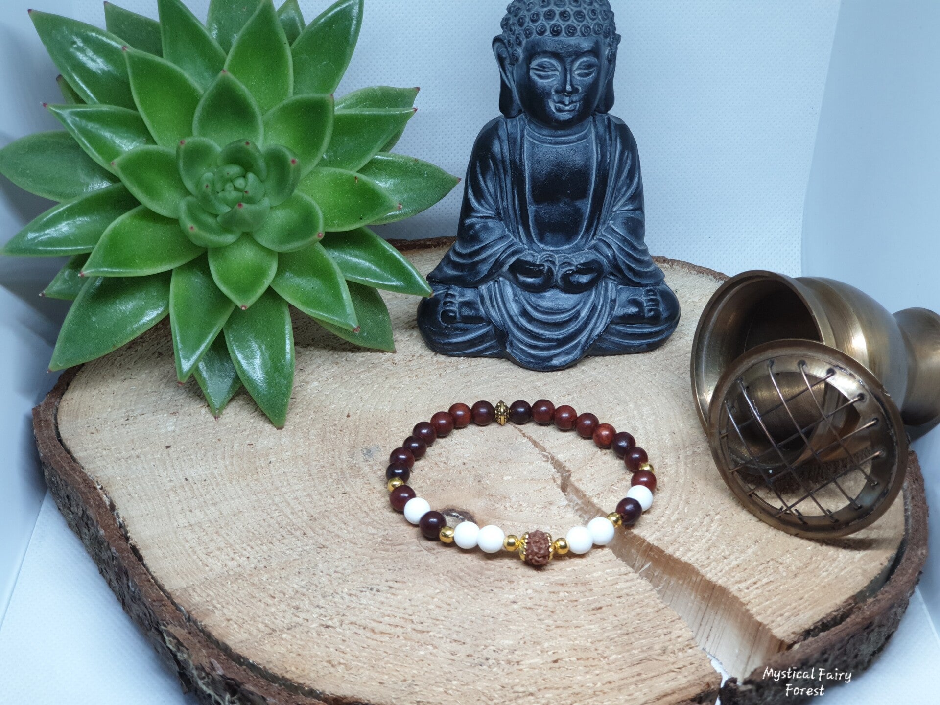 Ce bracelet a été réalisé avec des perles naturelles de Bois de Santal rouge de haute qualité de diamètre 6mm, des Perles de Bénitier (Tricdana) véritables de 6,5mm et d'une Graine de Rudraksha véritable de diamètre 8mm.