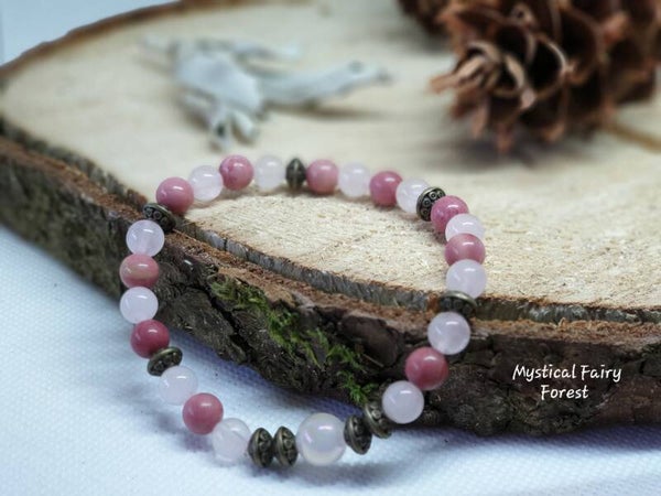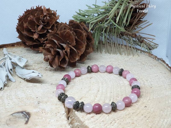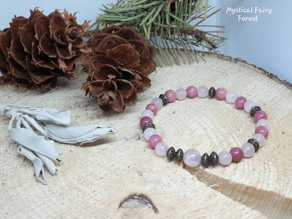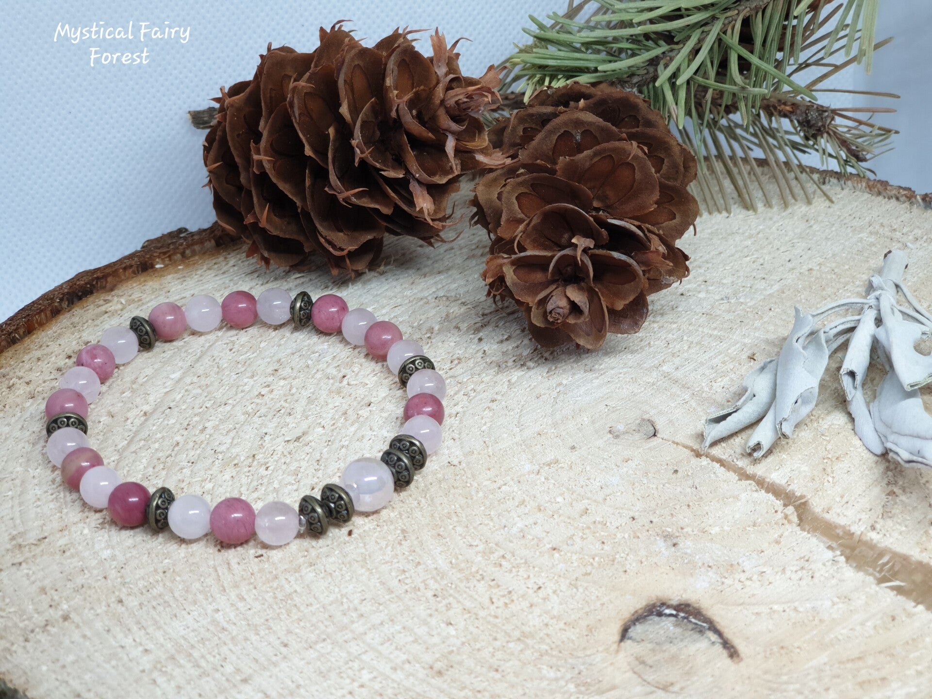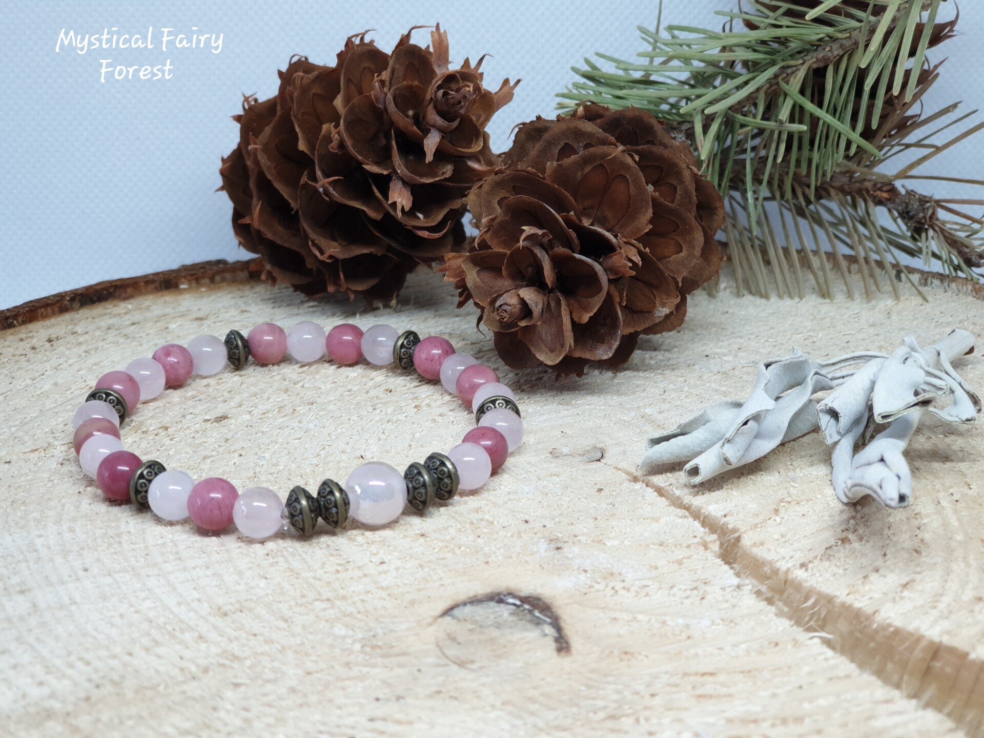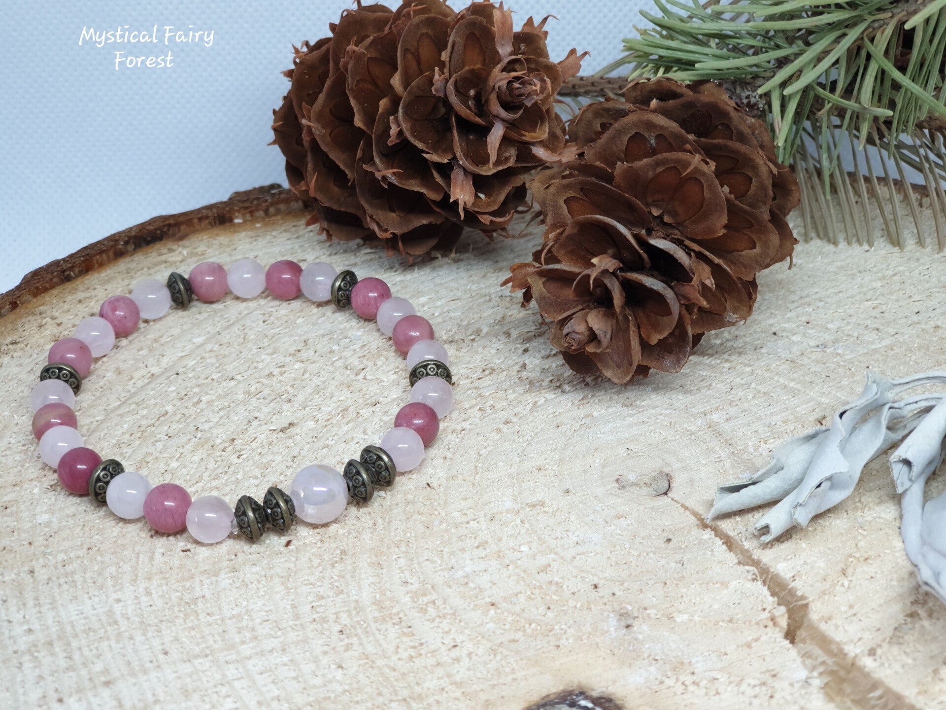 Les perles ont été soigneusement sélectionnées pour vous procurer tous les bienfaits (en lithothérapie) de la pierre de Rhodonite, du Quartz rose et du Quartz Aqua Aura.