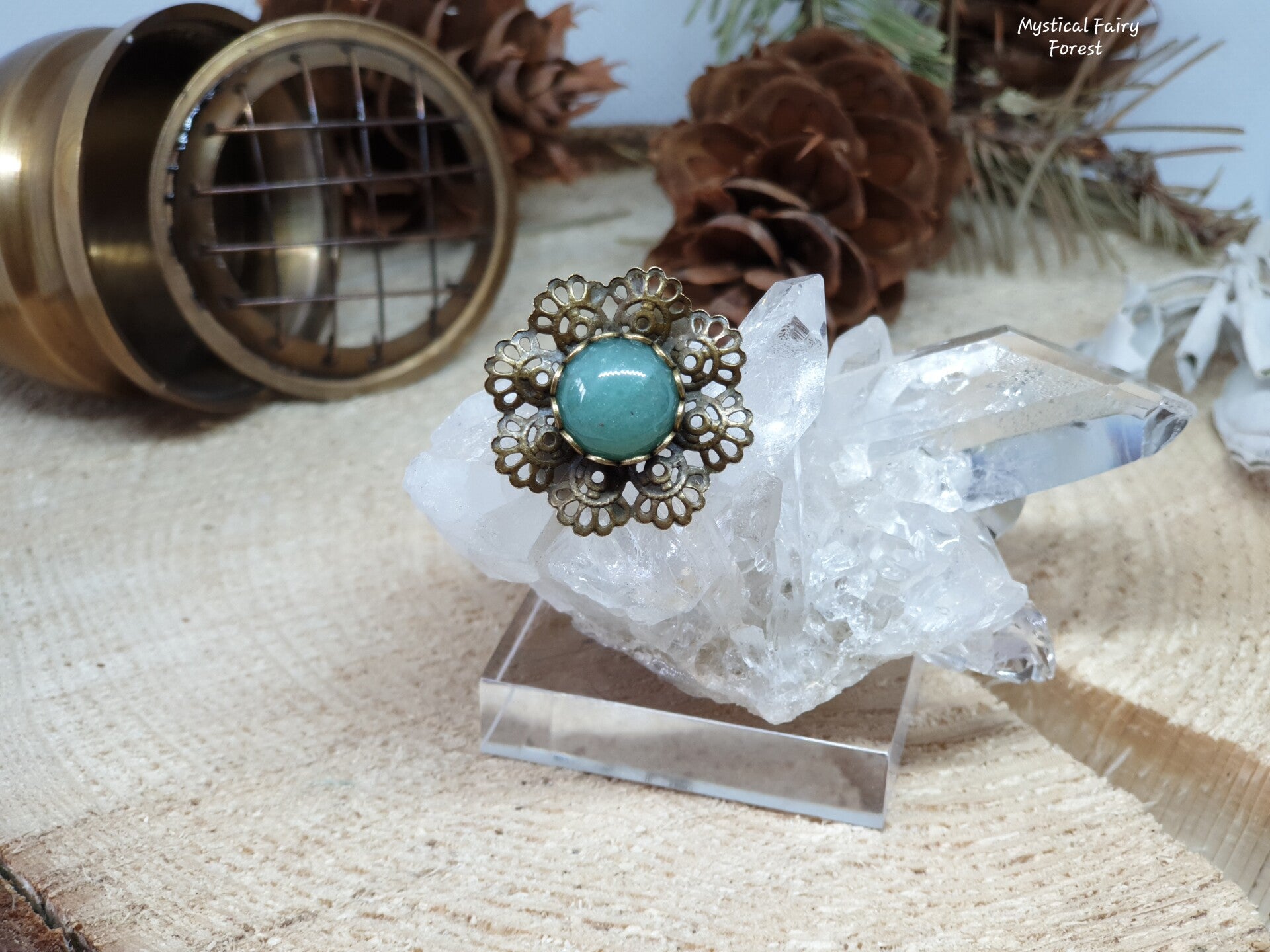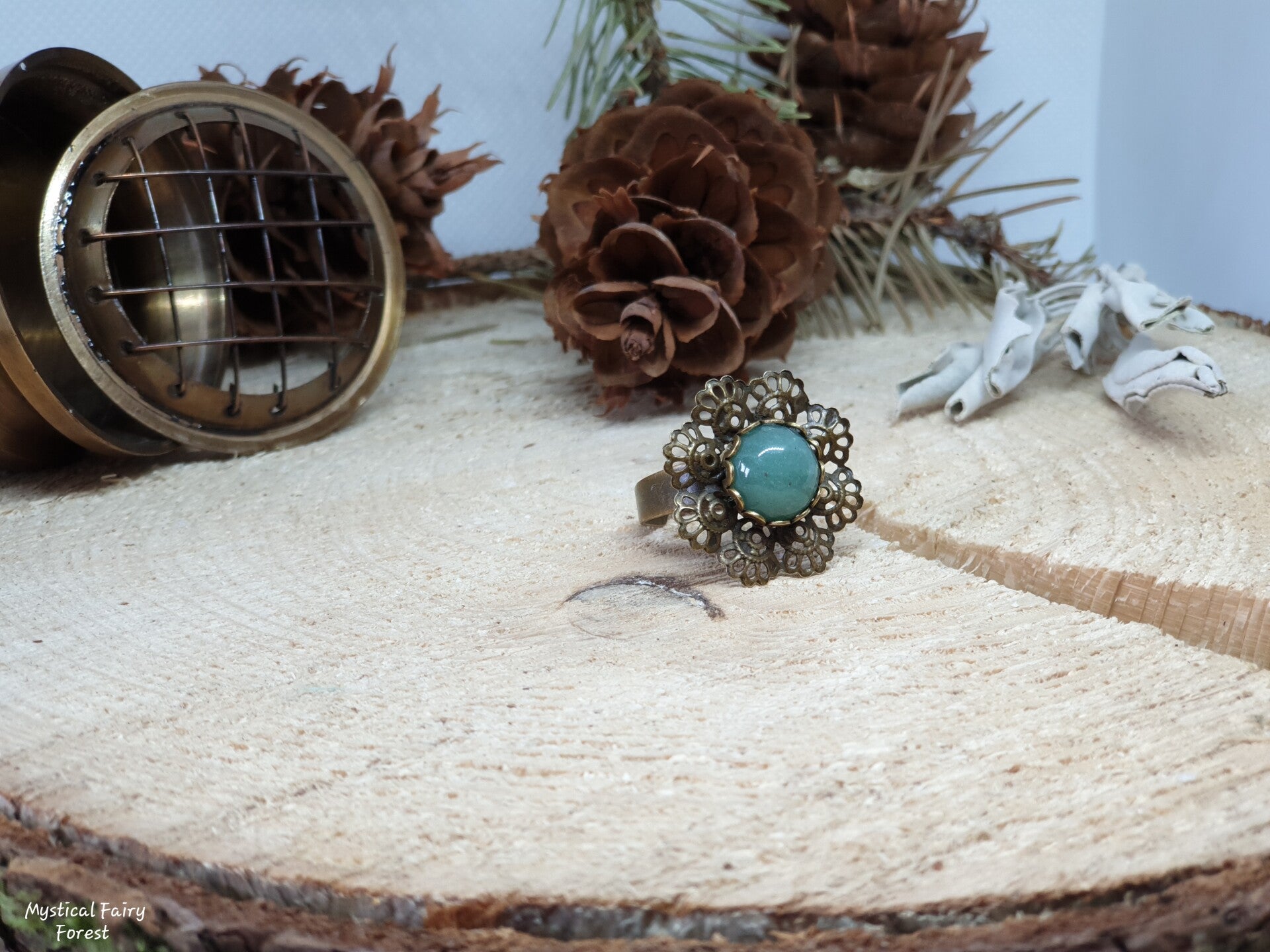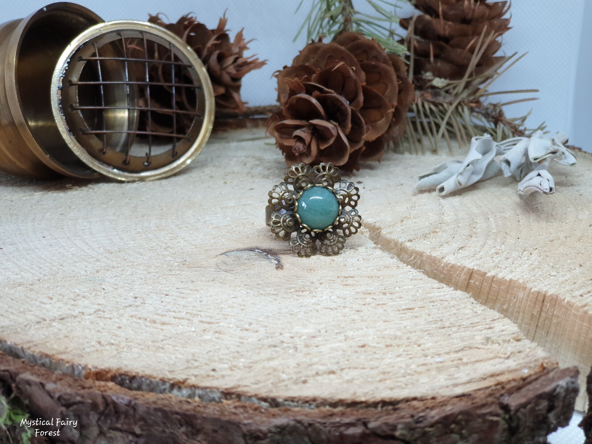 Bague réalisée avec un cabochon d'Aventurine de diamètre 10mm de qualité supérieure serti sur un support en métal Bronze Antique.